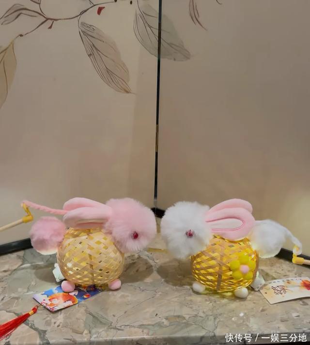 她手里拿着竹编的小兔子灯,特别可爱,很有节日的氛围感,应该是给两个女儿准备的,一人一只小兔子花灯,小女生看了肯定会喜欢。