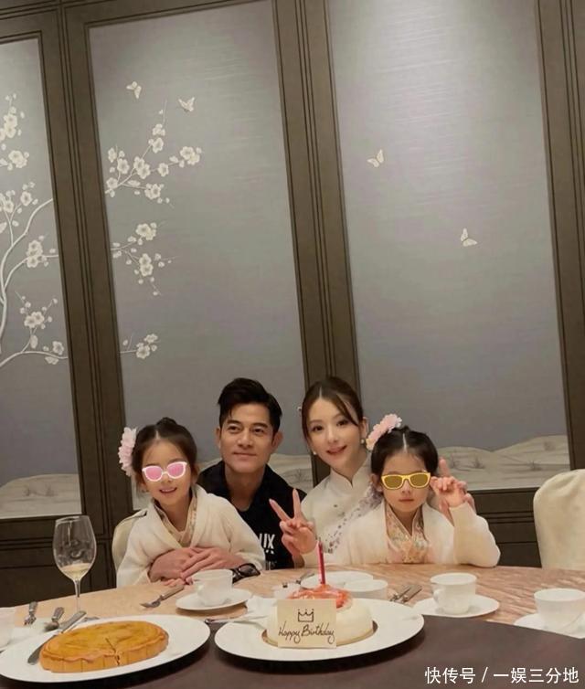 一家人坐在餐桌前拍照,郭富城和方媛各自抱着一个女儿,两个孩子穿着姐妹装,长相也很像,不知道的还以为是双胞胎呢。郭富城穿着黑色的衣服,头发又黑又多,看着一点也不像快六十岁的,倒像是三四十岁的小伙子!